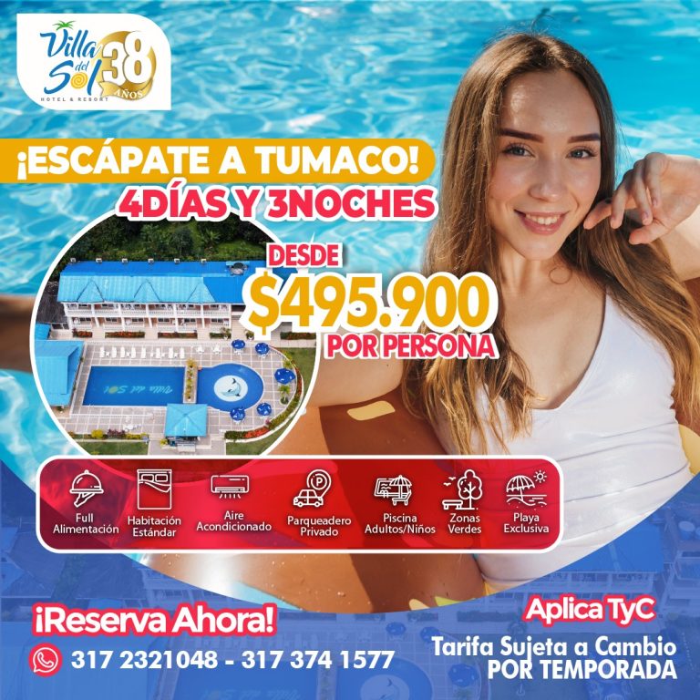 Si buscas alojamiento en Tumaco, a solo unos pasos de la playa exclusiva y rodeado del encanto del Pacífico, el Hotel & Resort Villa del Sol te ofrece confort, gastronomía local y experiencias únicas frente al mar. Con amplias zonas verdes, piscinas, spa, senderos y una ubicación privilegiada en Isla del Morro, aquí encontrarás el descanso perfecto para desconectar y disfrutar. Un resort histórico, renovado y con la mejor atención del litoral. ¡Vívelo!